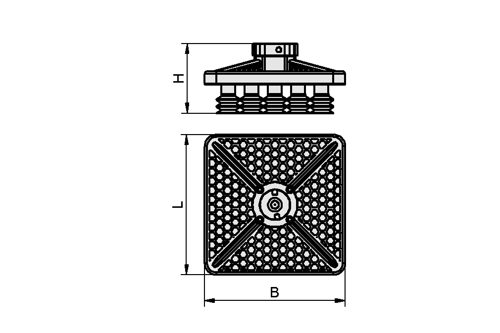 Kwadratowy chwytak dużej powierzchni z przyssawkami SPB2 — wysoka stabilność, dobre prowadzenie detali różnej wielkości. Ten chwytak jest przeznaczony do stosowania z elektryczną pompą ECBPi.